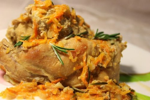 Потом добавляем тертую на крупной терке морковь, перец, чеснок, сливки, листики розмарина, солим, доливаем воды (3/4 от объема кролика) и тушим под крышкой полчаса.