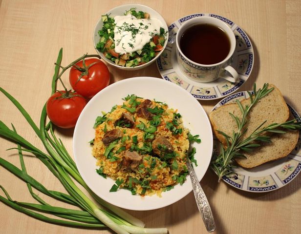 Кускус залить кипятком и накрыть крышкой, когда он впитает воду, смешать с мясом. Готовое блюдо можно посыпать петрушкой или кинзой.