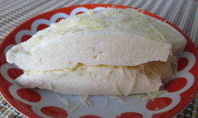 3. Перекладываю на тарелочку, разрезаю пополам. На одну половинку складываю натертый на мелкой терке сыр (можно просто тонкой пластинкой), сверху складываю вторую половинку омлета. И досыпаю остаток сыра.