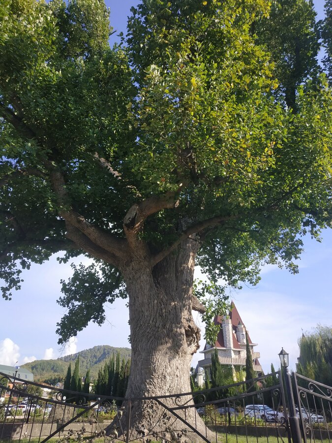 В Головинке, куда я в отпуск езжу, огромное старое тюльпановое дерево. Ему около 250 лет. Два раза в него била молния. Выжило. Сейчас оно укреплено и цепями, и арматурой специальной, чтобы не разрушилось. Мы перед отъездом вечером туда обязательно приходим. Тишина, шумят листья и море неподалёку. Такая красота))