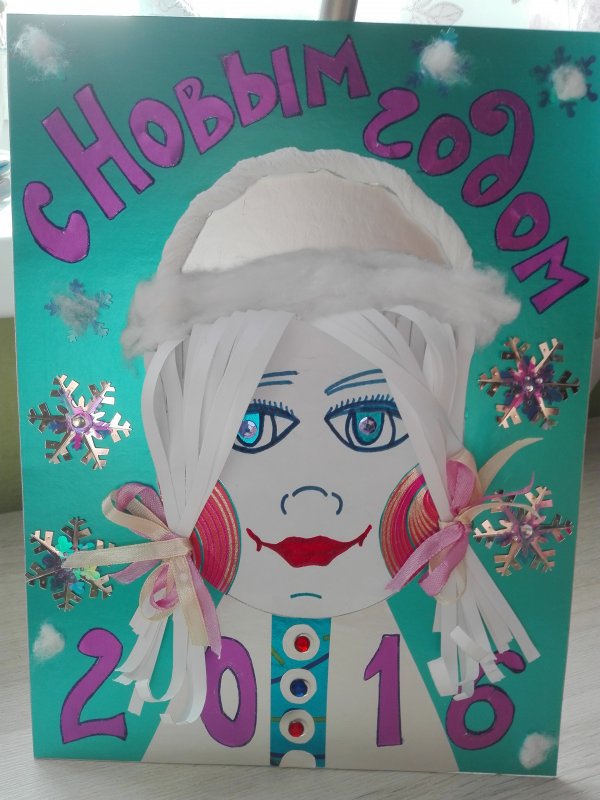 3D открытка "Снегурочка" (техника объемная аппликация, использованы: картон, цветная бумага, клей, фольга, бумажные салфетки, вата, пайетки, стразы, ленточки)