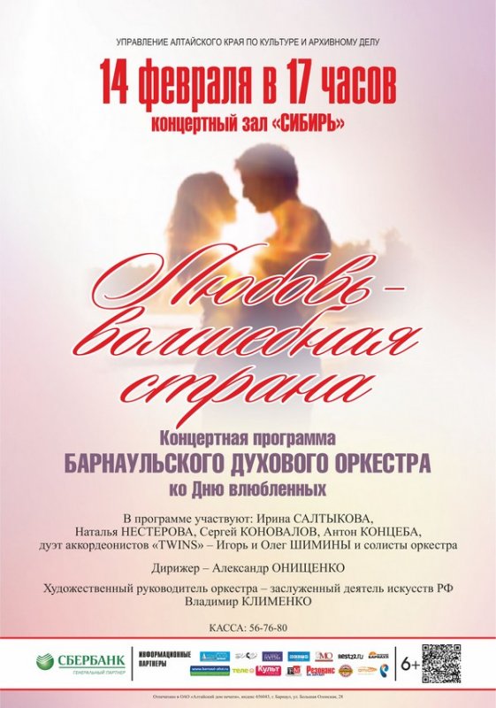 Именно такие произведения включены в концертную программу Барнаульского духового оркестра «Любовь – волшебная страна». Также под влиянием любви композиторы совместно с поэтами выражают свои чувства в виде песни. «О любви, не мало песен сложено…»- и это тоже о нашей программе, в которой прозвучит лишь малая часть из них – замечательных, имеющих самую широкую возрастную аудиторию, наполненных нежностью, грустью и хорошим настроением.