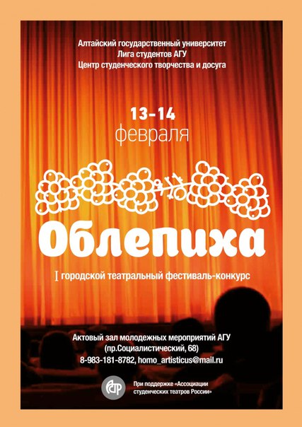 Театральный фестиваль-конкурс «Облепиха»: Возможность для школьников и студентов заявить о себе. 13 февраля — 14 февраля в 10:00, Актовый зал корп."С" АГУ