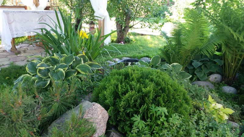 Все обсмотрела, в каждый уголок заглянула. Очень уютно, аккуратно, ухоженно. Никакого перебора в растениях, глаз отдыхает на оттенках зеленого. И всему место нашлось: Розы шикарные, ёлки жирные, кусты круглые, беседка воздушная, барбекю основательное.
