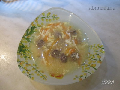 Бульон сливаю обратно в кастрюлю, то что выкипело, доливаю кипячёной водой. Ставлю на огонь, когда закипит делаю картошку, когда она почти готова делаю мелкую вермишельку и порезанную морковку, которая варилась в бульоне.