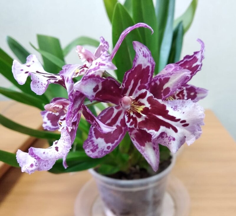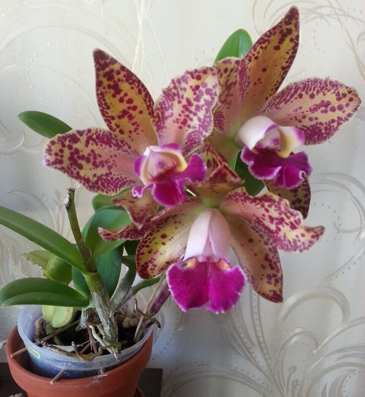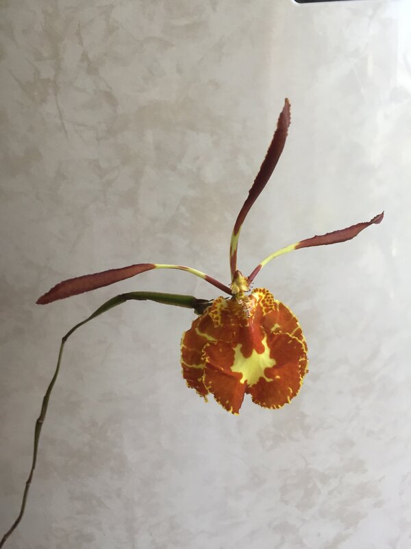 Onc. Papilio*sanderae или в простонародье Онцидиум Бабочка. Кто то называет такие онцидиумы тараканы Этот милашка приехал ко мне из Тюмени в 2010 году. Долго мы присматривались друг к другу, пару раз он пытался помереть. Пробовала садить его в горшок, пробовала разные субстраты, а оказалось он чистой воды блочник. Каждый год прирост в 1 бульбу. Зацветать ни как не хотел! И вот спустя 8 лет уговоров и танцев с бубном, я увидела Онцидиум во всей красе бутон держится примерно 5-6 дней, затем отмирает. На месте старого бутона зацветает новый. Цветение револьверное в течение полутора лет.