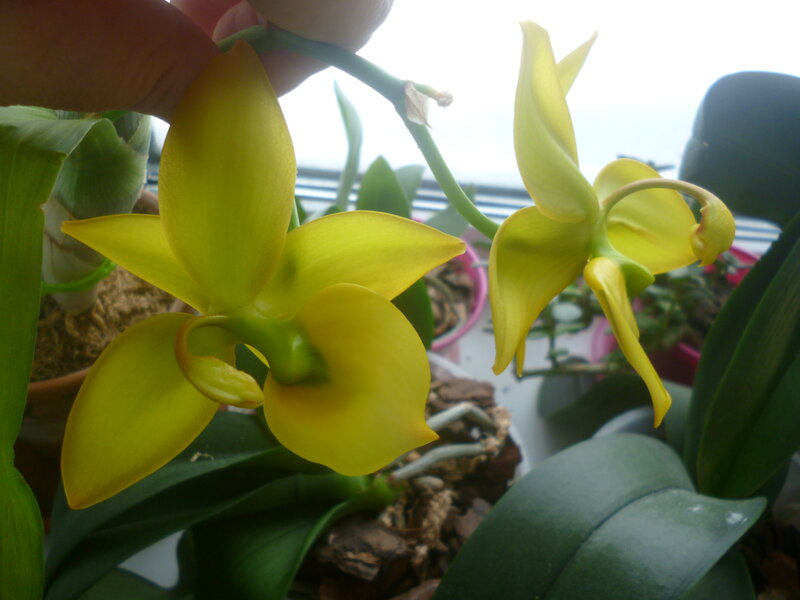 На первом фото онцидиум психопсис. Растет во мхе. Цветение револьверное, длится около двух лет. Довольно беспроблемная орхидейка.