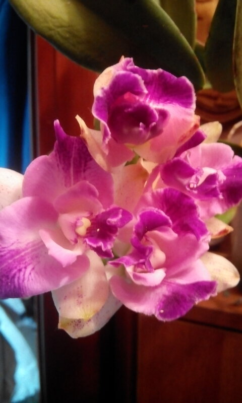 А на втором каттлея, которая довольно долго хотела меня покинуть. Цветет у меня второй раз. Первый разбыло всего лишь два цветочка. В этот раз получился букетик из пяти цветков. Очень ароматная
