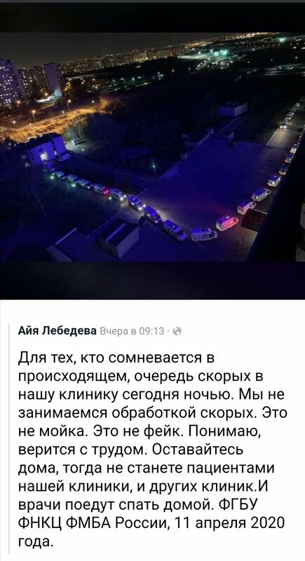 А сейчас по НТВ в новостях показали это же фото-видио, говоря что это очереди из скорых, которые привезли зараженных в больницу.