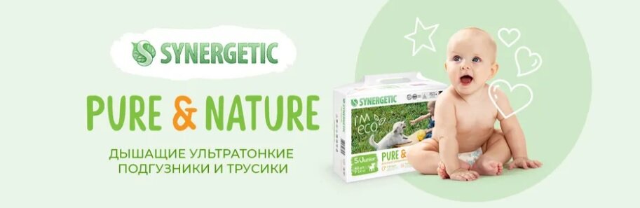 Подгузники SYNERGETIC Pure&Nature ультратонкие, ультрадышащие, ультрасовременные.