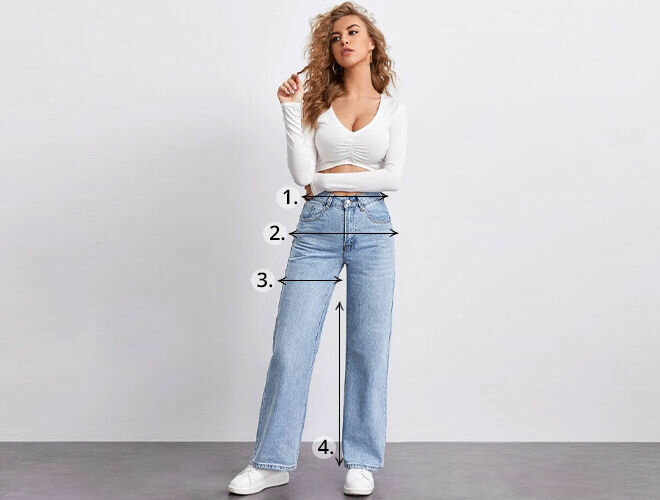 Перед тем, как отправиться за идеальной парой джинсов, вооружитесь сантиметровой лентой. Снимите с себя мерки, чтоб узнать объем талии (1) и ягодиц (2), обхват бедра (3), а также длину внутреннего шва (4). Последний параметр определяют, приложив к ноге ленту и протянув ее от щиколотки до паха. У джинсов для невысоких девушек (до 165 см) шов около 75 см, среднего роста — 81 см, высоких (от 172 см) — 88 см.