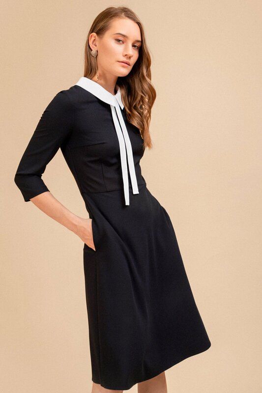 Платье темно-синего цвета. Горловина оформлена белым отложным воротником и бантом. Бант можно отстегнуть. В боковых швах есть карманы.