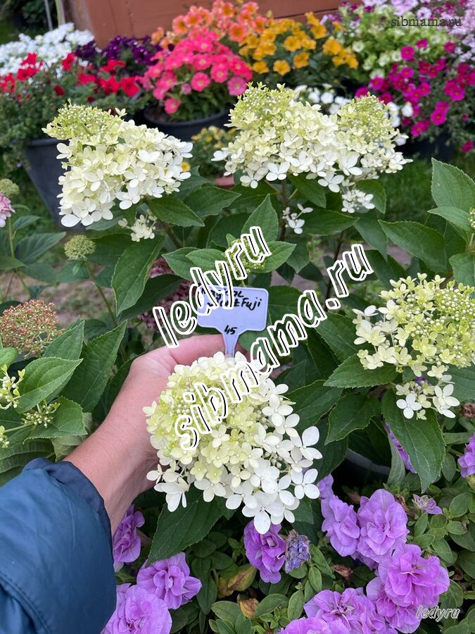 Компактный сорт, высота кустарника не превышает 90 см. Побеги прочные, вертикальные, листья удлиненные, темно-зеленые. Цветение длится с июля до сентября, удивительные крупные соцветия этой гортензии, белые при распускании цветов, ближе к осени окрашиваются в потрясающе насыщенный розово-малиновый цвет, добавляющий саду сочной красоты и яркости! Купить саженцы гортензии метельчатой Мэджикал Маунт Фуджи стоит для формирования невысокой живой изгороди, украшения миксбордеров, берегов водоемов, зон отдыха, сорт замечательно выглядит в одиночной посадке и в составе группы с хвойниками, вечнозелеными растения