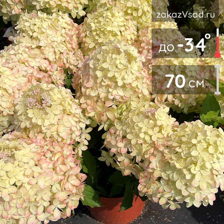 При небольшой высоте (до 70 см) размер соцветий может достигать 30 см! Цветы в начале цветения зеленовато-кремовые, затем постепенно розовеют. Цветение гортензии продолжается с июля до поздней осени. Купить саженцы гортензии XS Лайт стоит для украшения зоны отдыха.