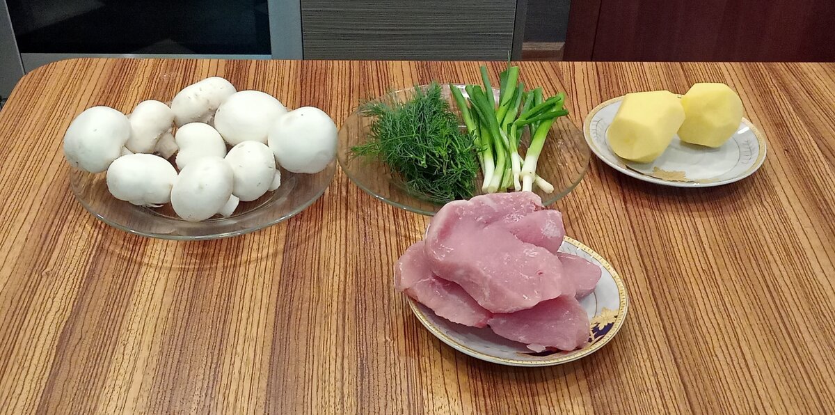 Две картошки. Шампиньоны (лисичек в магазине сегодня не было ) лук головки от пера, укроп. Сливки.