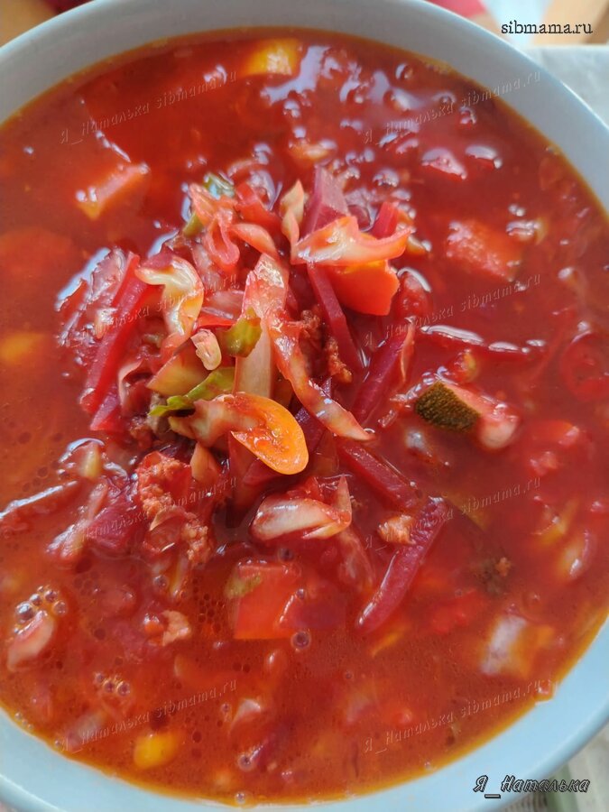 У меня почти классический борщ. Почти, потому как вместо картошки кабачок кубиками, а видов капусты два - белокочанная и цветная. А так, всё как полагается: лук, морковь и свекла соломкой и обжарены на сковороде, добавлена после обжарки к овощам томатная паста и ещё несколько минут протушивается всё вместе, чтобы получился красивый красный цвет. А потом всю эту прелесть в кастрюлю, где уже сварилось мясо, капусты и кабачок. И ещё 5 минут покипеть. А потом в тарелку добавить немножко чеснока, сметаны, рядом положить свежеиспечёный хлебушек и наслаждаться!