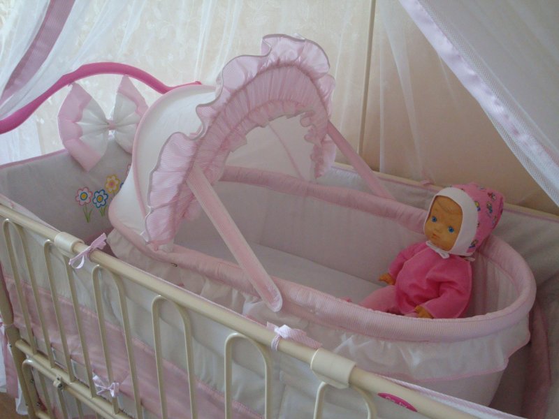 На балконе дите летом в ней загорало (мы летние), по комнатам квартиры я таскала и дите удобно было. Все-таки кроватка большевата малышу до3 мес. А с 6-7мес. мы сразу на детский диванчик перебрались - в кроватке так и не спали!