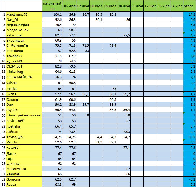 В табличке буду размещать по количеству сброшенных кг, чем больше сброшено, тем выше место)))