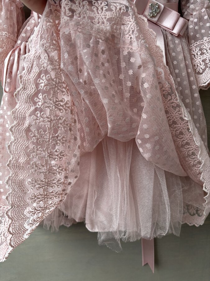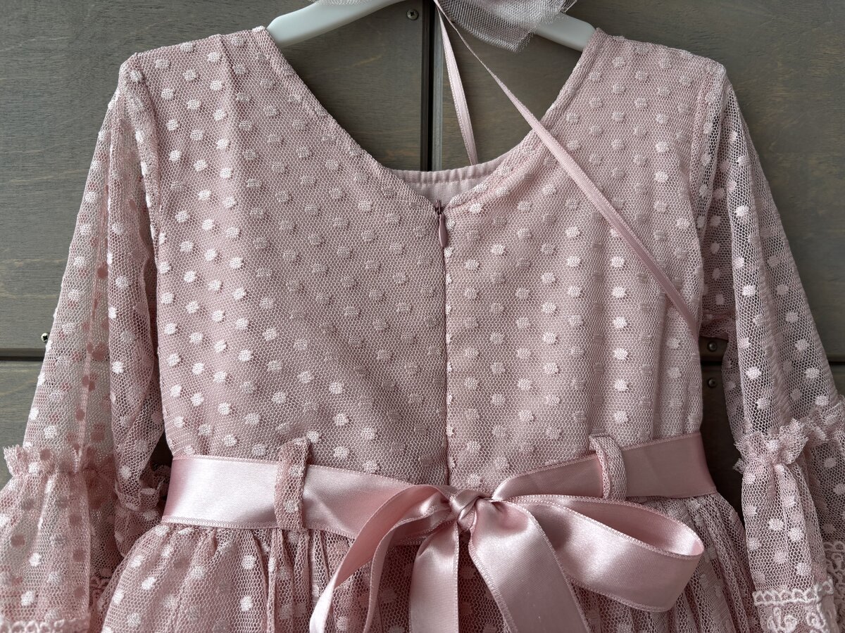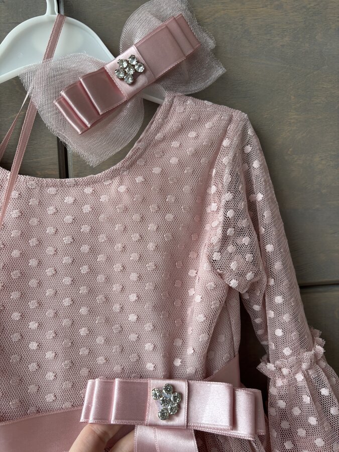 Платье в состоянии нового, было надето один раз на фотосессию в выпускной группе детского сада. Но на бантиках на поясе и заколке не хватает по одному камешку (отвалились сразу при покупке)
