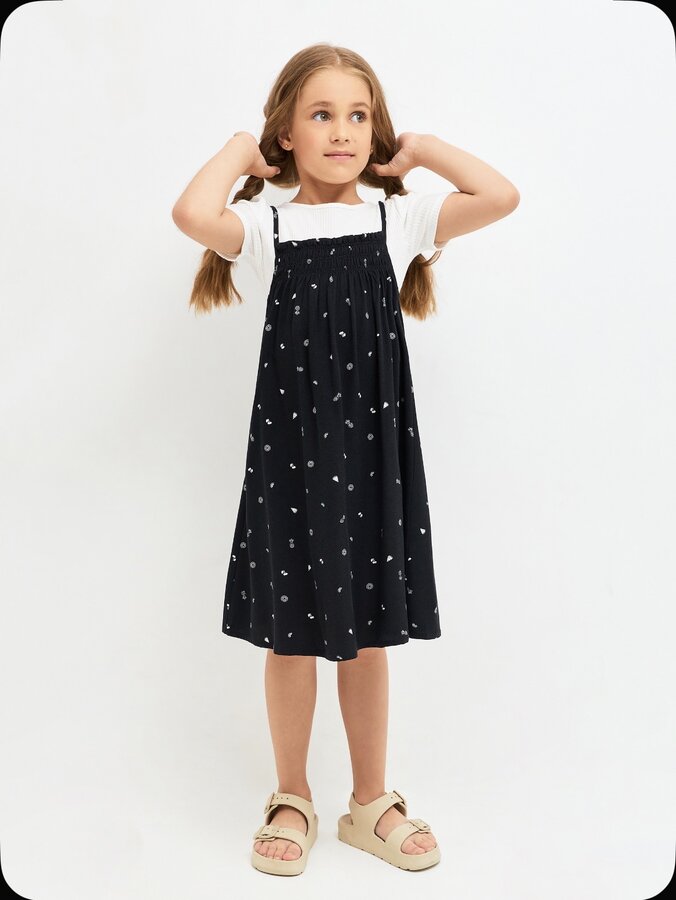 Стильный комплект для девочек состоит из белой хлопковой футболки в рубчик приталенного силуэта и сарафана свободного кроя из легкой и воздухопроницаемой вискозы с монохромным дизайнерским принтом. Спереди верх сарафана собран на резинки. Тонкие бретели имеют возможность регулировки. Стильная и универсальная модель.